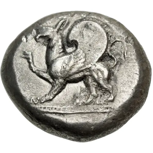 Artistry: The coin exemplifies the Archaic Greek stylistic school, characterized by powerful, albeit somewhat rigid, animalistic designs. While no specific engraver is identified, the obverse prominently features the iconic Abderan griffin, a mythical creature with an eagle's head and wings atop a lion's body, typically depicted seated or rearing. This formidable beast served as the city's civic emblem, rendered with a nascent naturalism. The reverse maintains the early Archaic tradition of a simple, geometric incuse square, often quartered or segmented.