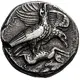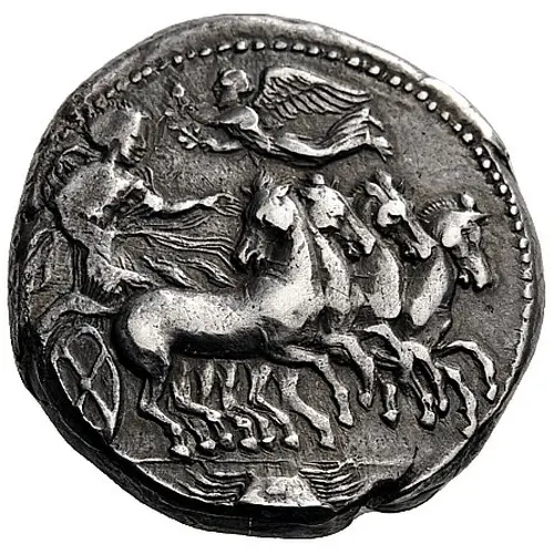 | Popis líce | Nymph or goddess, with her robes billowing behind her, driving quadriga galloping to right, about to turn. Above, Nike flying left to crown the charioteer and in the exergue, crab swimming downwards |