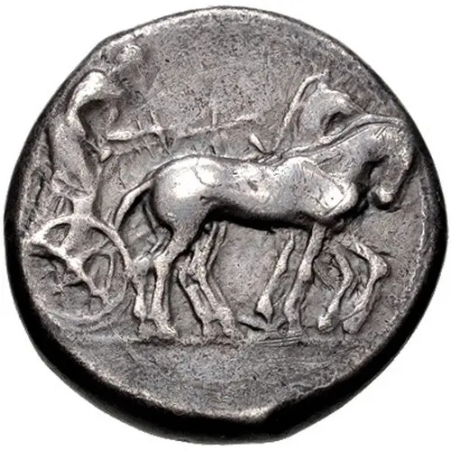 | Obverse description | Charioteer driving slow quadriga right |