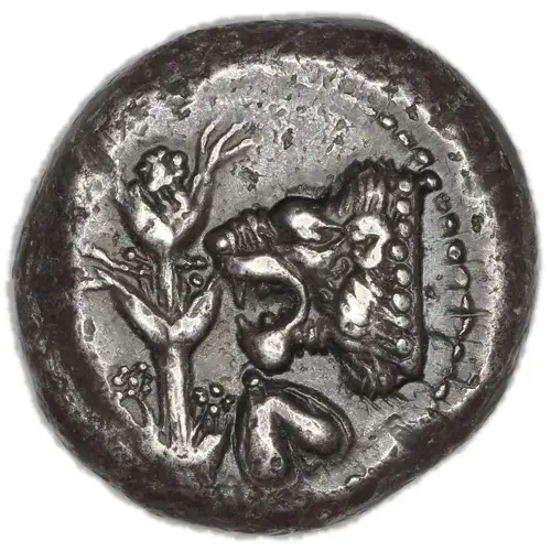| Ön yüz açıklaması | Silphium plant; on right, large lion`s head left, silphium fruit beneath jaw. |