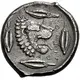 | Descripción del reverso | Lion`s head to right, with jaws open and tongue protruding; around, four barley grains. |
