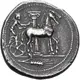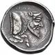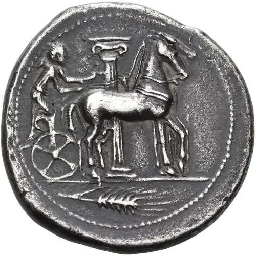 | Obverse description | Charioteer, holding the reins in his right hand and a goad in his left, driving a quadriga walking to right; behind, turning post in the form of an Ionic column; in the exergue, grain ear. |