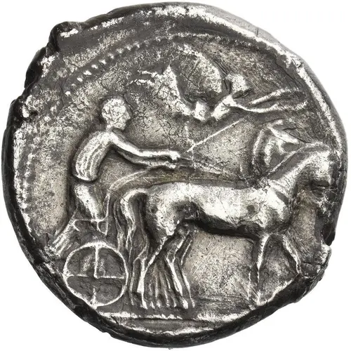 Slow quadriga driven right by charioteer holding kentron and reins; above, Nike flying right to crown the horses; in exergue, [ΓΕΛΟΙΟΝ] retrograde. |