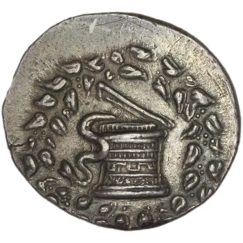 | Obverse description | Cista mystica with serpent; all within ivy wreath. |