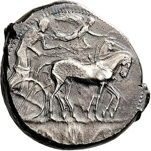 | Obverse description | Quadriga driven slowly to right by a bearded charioteer. Above, Nike flying right to crown the horses and in exergue, palmette with tendrils |