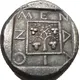| Descripción del reverso | Four bunches of grapes within linear square frame, all surrounded by shallow incuse frame containing city name. |