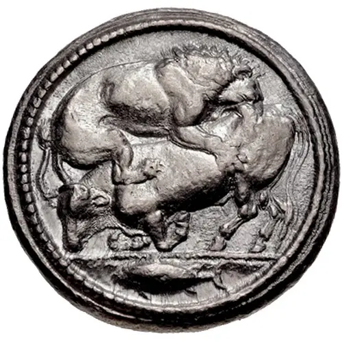 | Beschrijving voorzijde | Lion facing right attacking a bull that crouches left. In exergue a fish facing left. Beaded ring around all. |
