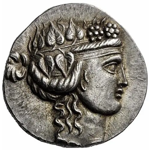 | Описание аверса | Head of youthful Dionysos to right, wearing ivy wreath and taenia |