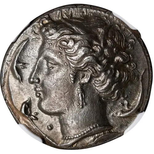 | Mô tả mặt trước | Head of Tanit left, wearing wreath of grain leaves, triple-pendant earring and pearl necklace; dolphin (s) around. |