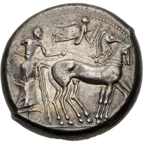 | Obverse description | Charioteer, holding kentron in right hand and reins in left, driving slow quadriga right; above, Nike flying right, crowning horses with open wreath held in both hands. |