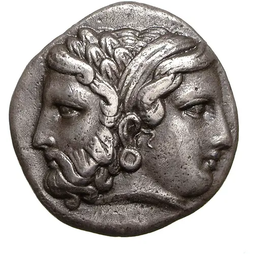 | 表面の説明 | Janiform head composed of a laureate and bearded head of Zeus to left and a diademed head of Hera to right. |