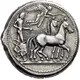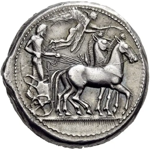 | Obverse description | Male charioteer, wearing a long chiton and holding a kentron in his right hand and the reins in his left, driving a slow quadriga to right; above, Nike flying right to crown the horses. |