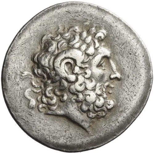 | Opis awersu | Laureate head of Zeus Ammon right. |
