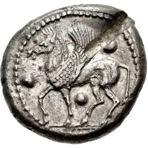 | Popis líce | Pegasos advancing left; three pellets around. |