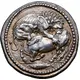 | Mô tả mặt trước | Lion to right, leaping upon and attacking bull with head up to left; in exergue, fish to left. |