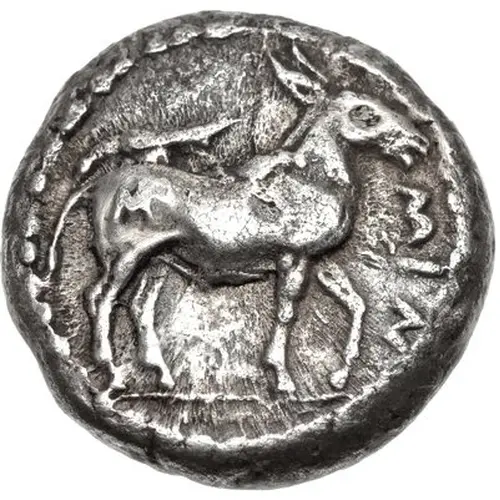 | Mô tả mặt trước | Mule advancing towards the right, M on hind quarter. On its back, there is a bird standing and facing left, pecking at its rump. |