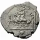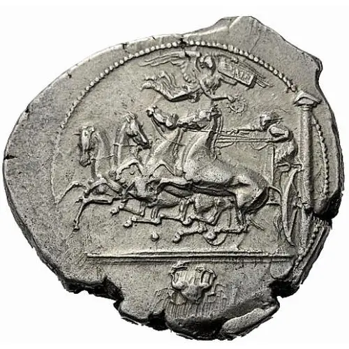 | Popis líce | Youthful charioteer, holding a goad in his right hand and the reins with both, bent forward driving a racing quadriga to left, just passing the turning post that can be seen behind him. Above, Nike flying to right, holding a wreath in her right hand and a tablet, inscribed ΕΥΑΙΝ, in her left, below horses, pellet and in exergue, crab swimming upwards |