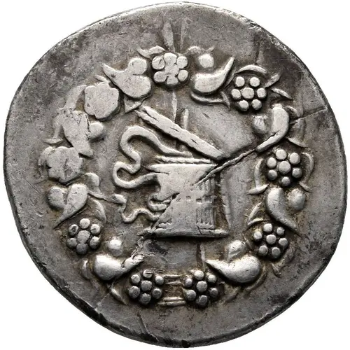 | Obverse description | Cista mystica with serpent; all within ivy wreath. |