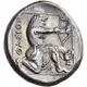 | Description du revers | Herakles, wearing lion`s skin headdress and short hunting tunic, kneeling to right, drawing his bow; on the lower right, kantharos. |