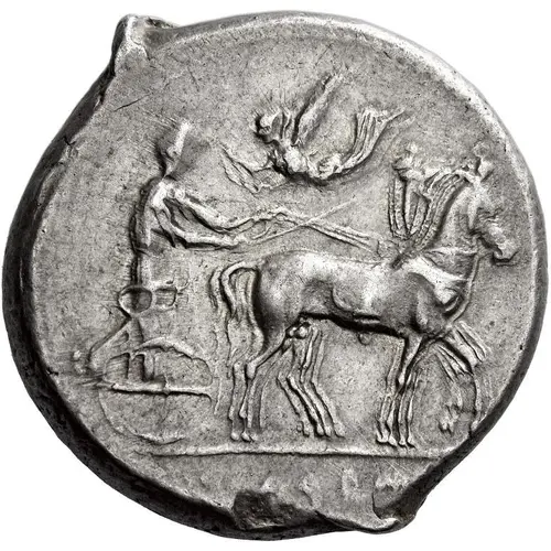 Obverse description Charioteer driving slow quadriga right, holding kentron in right hand and reins in left; above, Nike flying and crowning charioteer.