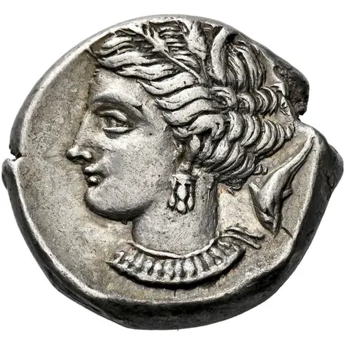 | Obverse description | Wreathed head of Tanit-Persephone left; wearing earring and necklace; in right field, dolphin. |