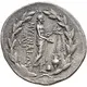 Opis rewersu Apollo Grynios standing right, holding branch and phiale; monogram to left, omphalos and amphora at feet; all within laurel wreath.