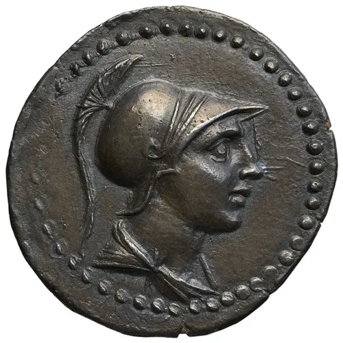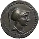 | Mô tả mặt trước | Draped bust of the hero Kibyrus (?) right, with helmet and spear over shoulder. |