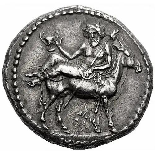 Ön yüz açıklaması Dionysos, bearded, and with his head facing turned slightly to left, wearing an ivy wreath and a chiton, holding a kantharos in his right hand and a thyrsos in his left, reclining to right on the back of a donkey walking to right; below, ivy branch.