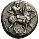 | 表面の説明 | Poseidon Hippios, nude, holding spear forward in right hand and reins in left, riding horse right. Below, dolphin left |