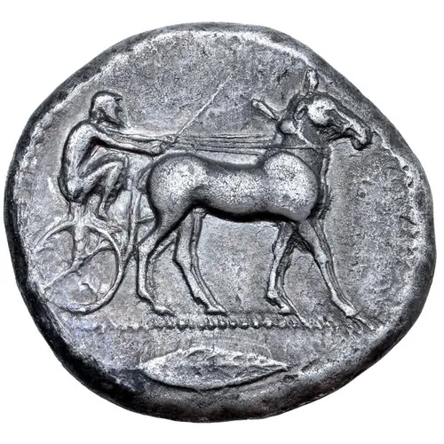 | Ön yüz açıklaması | Mule biga driven right by seated male charioteer; bay leaf in exergue. |
