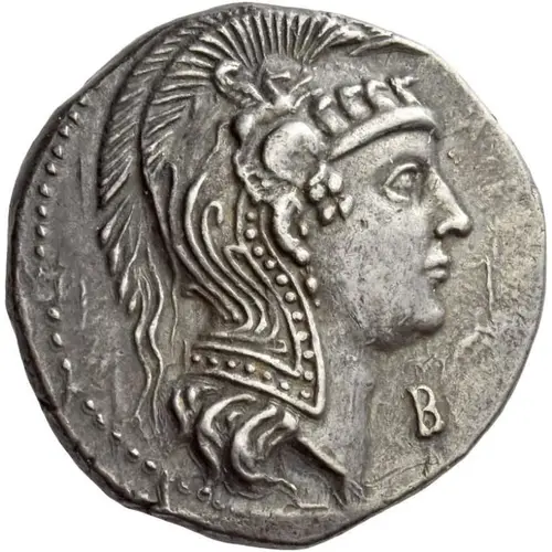 | Aversbeschreibung | Head of Athena Parthenos right, wearing triple-crested Attic helmet decorated with four foreparts of horses and a Pegasus; below, B. |