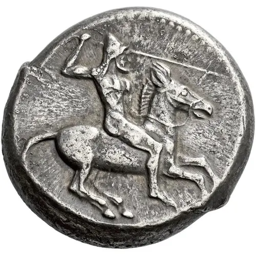 | Obverse description | Naked, bearded rider wearing conical helmet, on horse prancing right, spear in right hand, left holding reins. |