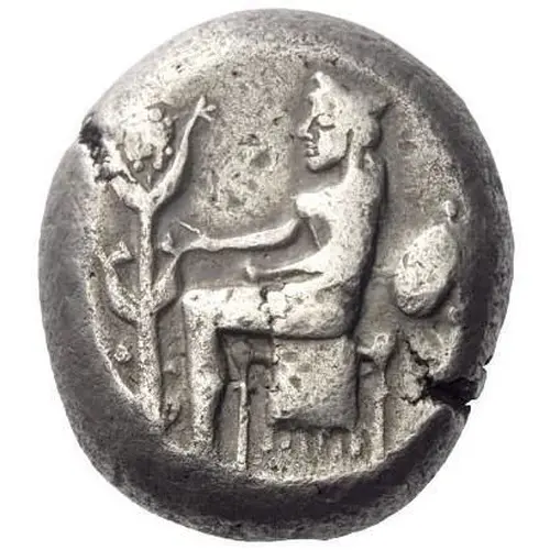| Ön yüz açıklaması | The city-goddess Cyrene, wearing stephane and a long chiton, seated left on diphros, her right hand reaching out to a plant of silphium; behind, silphium fruit. |