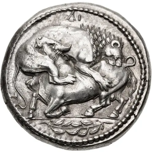 | Description de l’avers | Lion, right, attacking bull kneeling to left; ΔI above, laurel branch in exergue. |