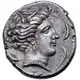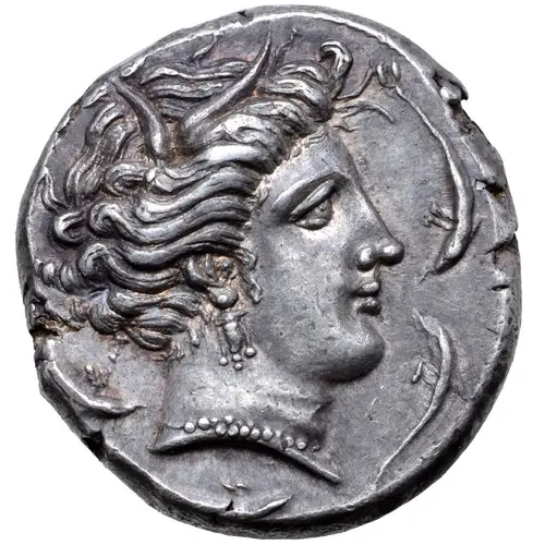 | Obverse description | Head of Tanit right, wearing wreath of grain leaves, triple-pendant earring and pearl necklace; four dolphins around. |