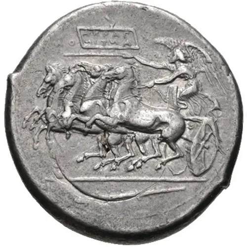 | Mô tả mặt trước | Nike, holding a kentron in right hand, reins in left and driving fast a quadriga towards the left. Above her, a tablet with the inscription in two lines (with the ИO- outside the tablet). |