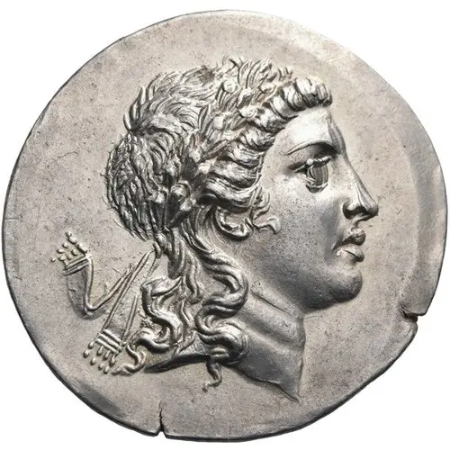 | Opis rewersu | Apollo Grynios standing right, holding branch and phiale; monogram to left, omphalos and amphora at feet; all within laurel wreath. |