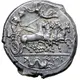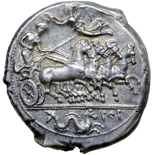 Obverse description Charioteer, holding kentron in left hand, reins in both, driving fast quadriga right; Nike flying left above, crowning charioteer with wreath she holds with both hands; hippocamp swimming to right in exergue, Punic ṢYṢ before.