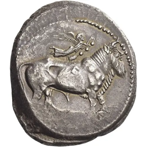| Obverse description | The river-god Amenanos as a bearded man-headed bull standing right; above, Nike flying right and holding taenia. |