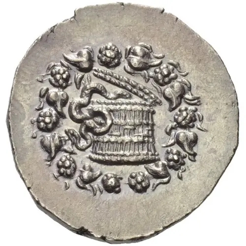 | Obverse description | Basket (cista mystica) from which snake coils and around, ivy wreath with fruits |
