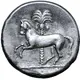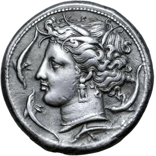 | Opis awersu | Head of Tanit-Persephone left, wearing wreath of grain ears, triple-pendant earring, and pearl necklace; four dolphins around. |