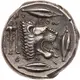 | Beschrijving keerzijde | Head of lion right, with jaws open and tongue protruding; behind, tripod; around, three barley grains. |