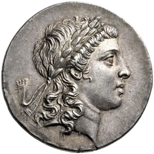 | Reverse description | Apollo Orynios standing right, holding branch and phiale; at his feet, omphalos and amphora. In inner left field, monogram. All within wreath. |