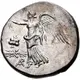 Arka yüz açıklaması Nike advancing left, holding wreath; pomegranate above winged thunderbolt and AP monogram in left field.