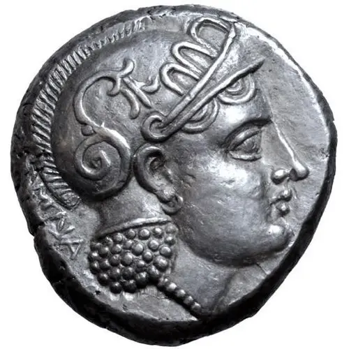 Obverse description Head of Athena right, wearing earring, necklace, and crested Attic helmet decorated with three olive leaves over visor and a spiral palmette on the bowl; MNA behind.