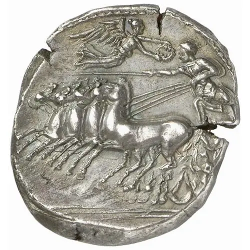 | Ön yüz açıklaması | Charioteer, holding the reins with his left hand and a goad in his right, driving quadriga galloping to left. Above, Nike flying right to crown the driver |