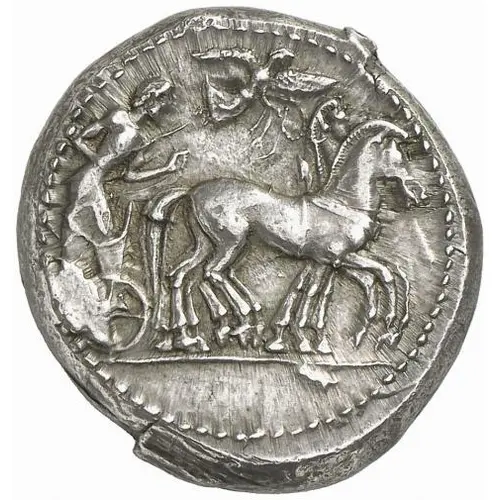 | Obverse description | Male charioteer, wearing a long chiton and holding a goad in his right hand and the reins in both, driving a walking quadriga to right. Above Nike flying right to crown the horses |