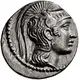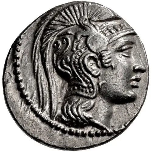 Head of Athena Parthenos right, wearing single-pendant earring, necklace, and triple-crested Attic helmet decorated with the foreparts of four horses above the visor, a Pegasus in flight rightward above the raised earpiece, and a curvilinear ornament on the bowl. |