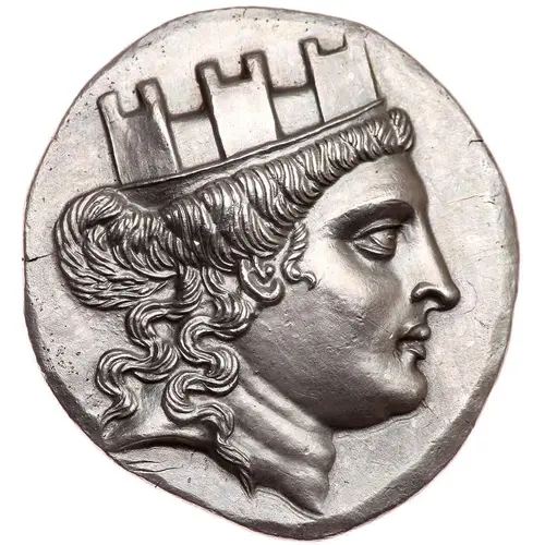 | Descripción del anverso | Head of Tyche right, wearing turreted crown. |