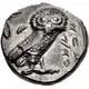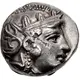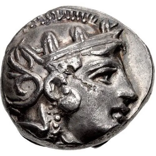 | Descrizione del dritto | Head of Athena right, wearing earring and crested Attic helmet decorated with three olive leaves over visor and a spiral palmette on the bowl. |